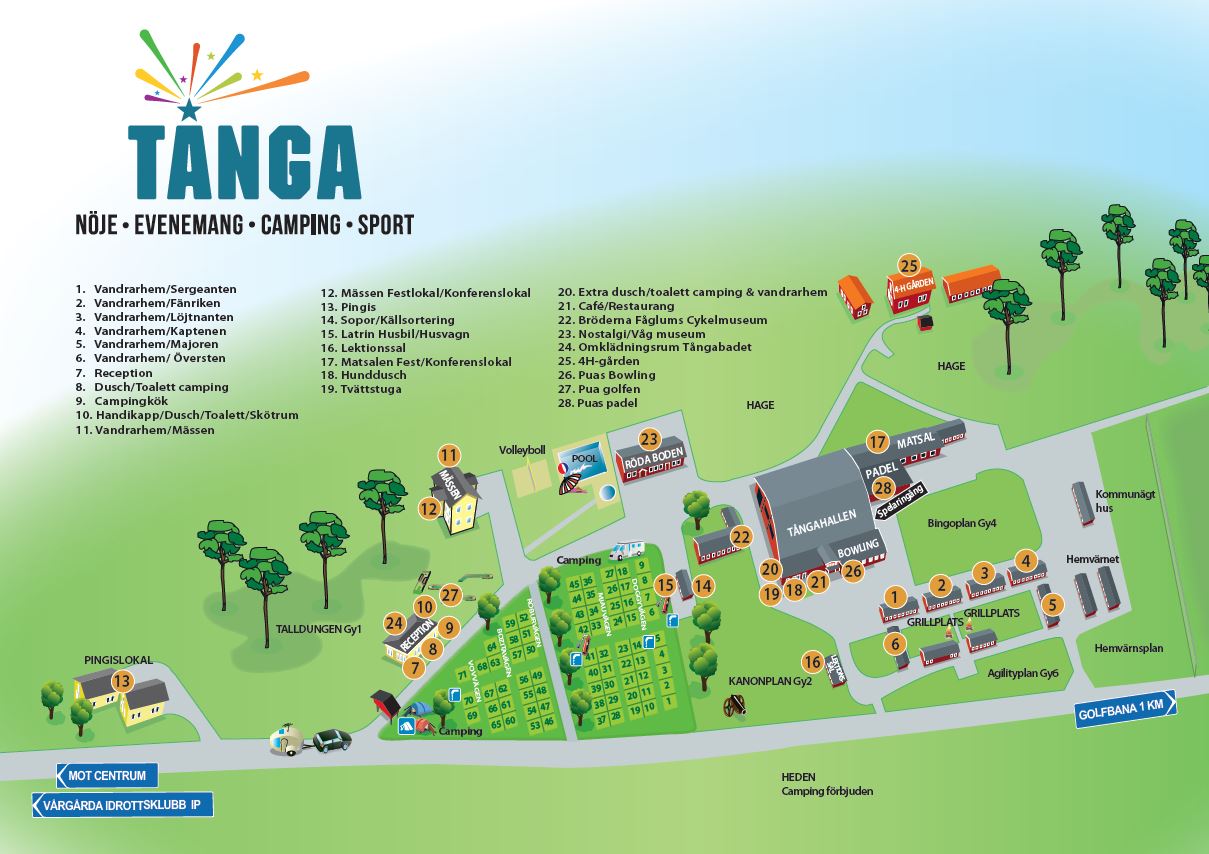 På Tånga finns både camping och vandrarhem på bekvämt promenad avstånd till våra lokaler och grönytor. Vår camping har 71 ordinarie platser med el och vid större evenemang kan vi använda talldungen till extra camping för att få ytterligare 4500 m2 campingplats. Våra vandrarhem bär alla på militära namn efter den tid då Tånga Hed var militärens övningsfält.